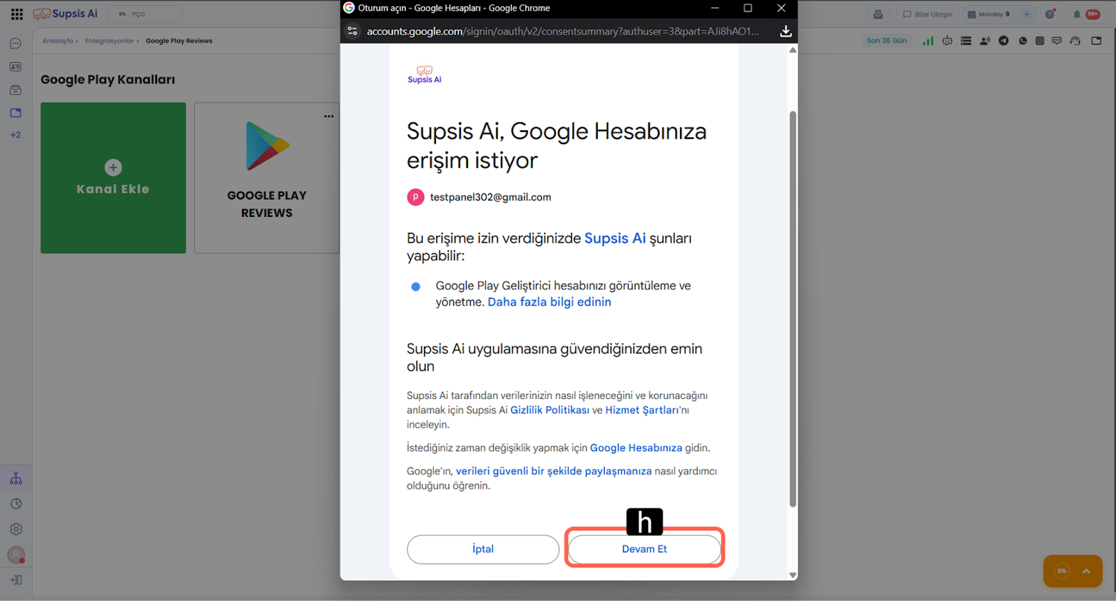 Dokümanın bu bölümü, Supsis Ai'de Google Play yorumları entegrasyonunu sağlamak için gerekli olan Google yetkilendirmelerini tanımlama adımlarını içerir. İşlem sırasında sistem sizi yetkilendirme işlemleri Google paneline yönlendirecektir.