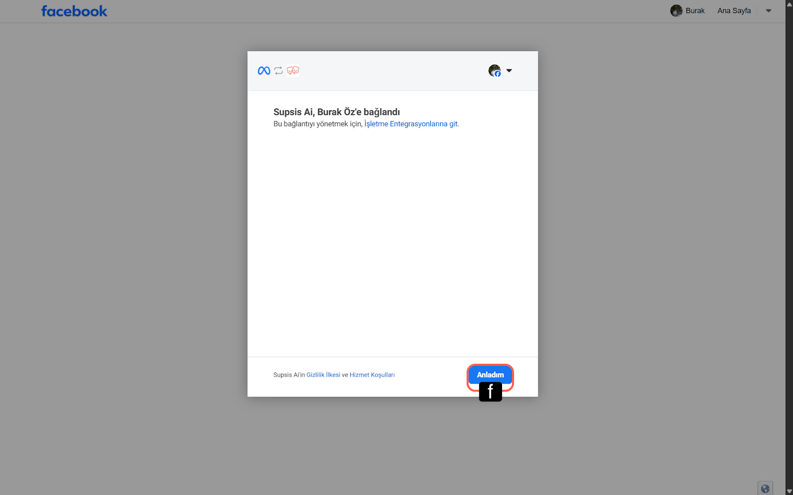 İşlem başarıyla tamamlandığında, "Supsis Ai ... bağlandı" şeklinde bir onay ekranı gösterir. Anladım butonunu tıklayarak işlemi sonlandırın.