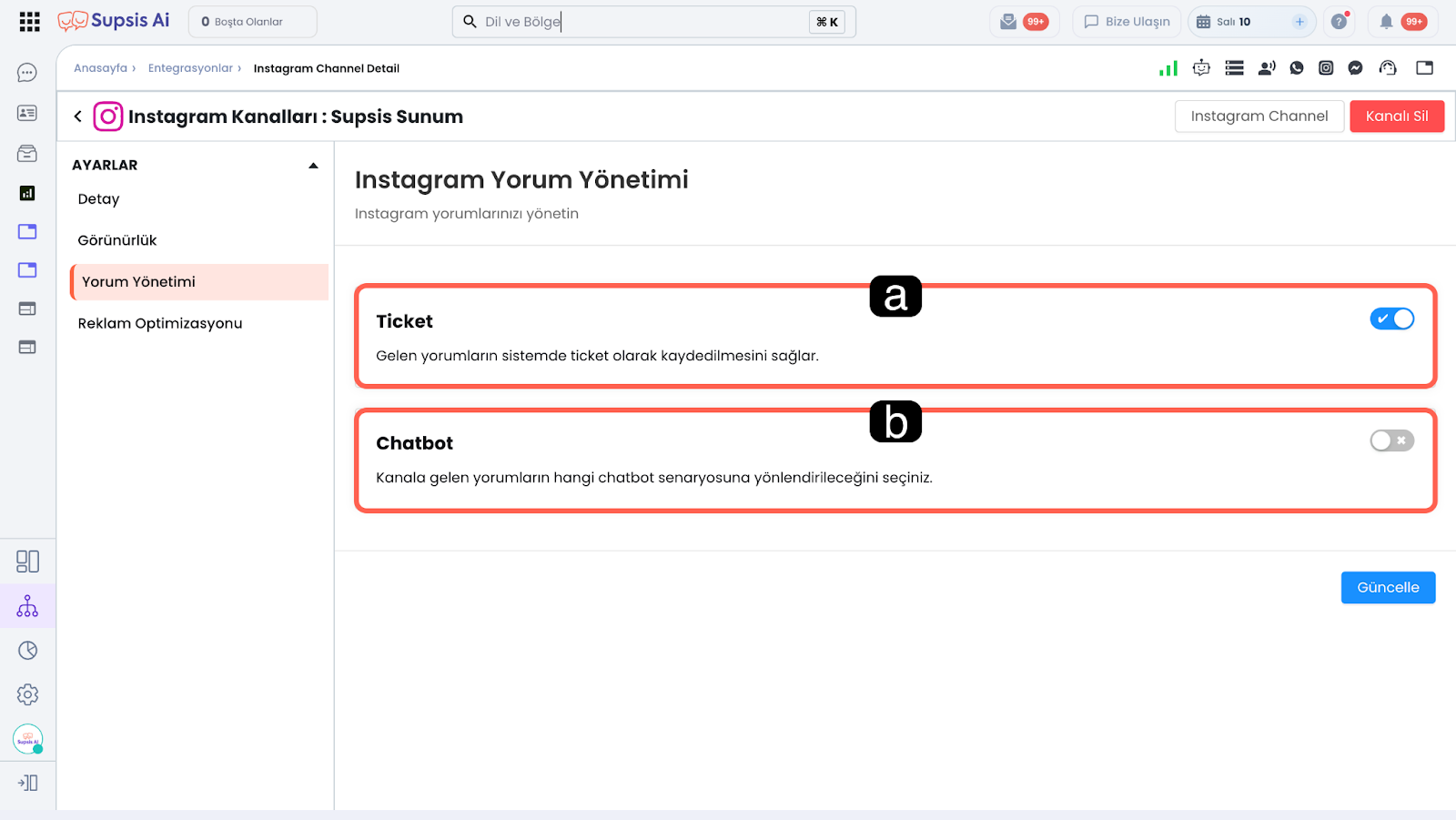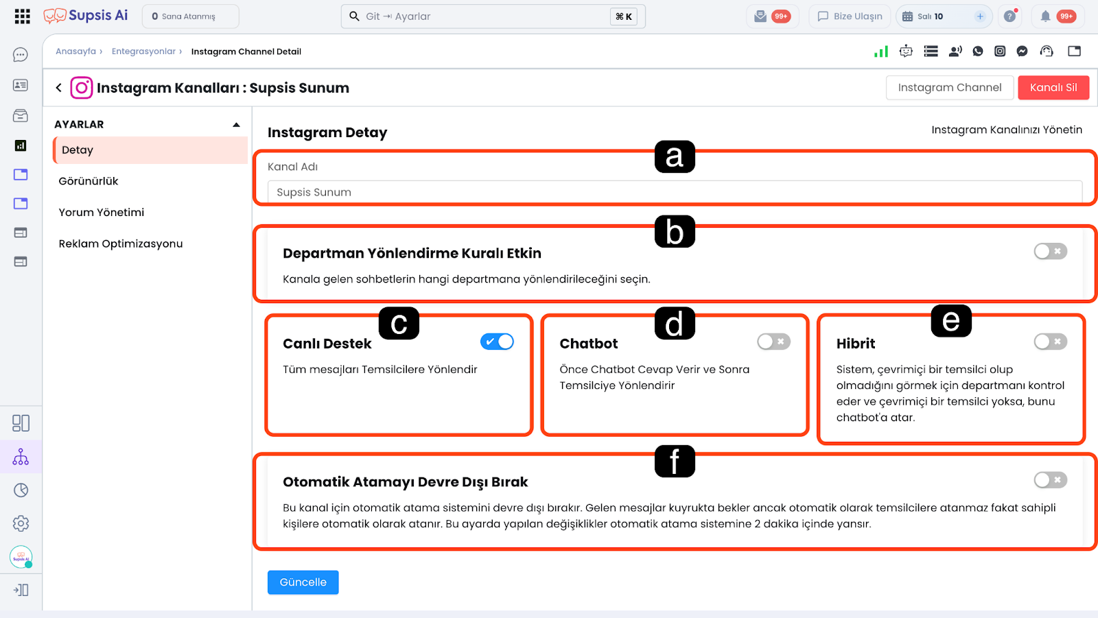 Entegre ettiğiniz Instagram kanalınızın Supsis Ai paneli içindeki çalışma özelliklerini ve ayarlarını bu alandan görüntüleyebilir ve düzenleyebilirsiniz.