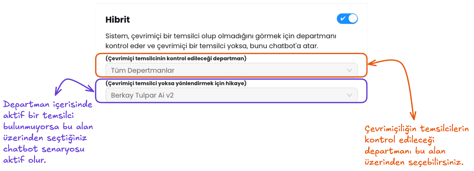 Hibrit modunda yönlendirme, seçilen Departman ve Chatbot arasında koşullu olarak çalışır.