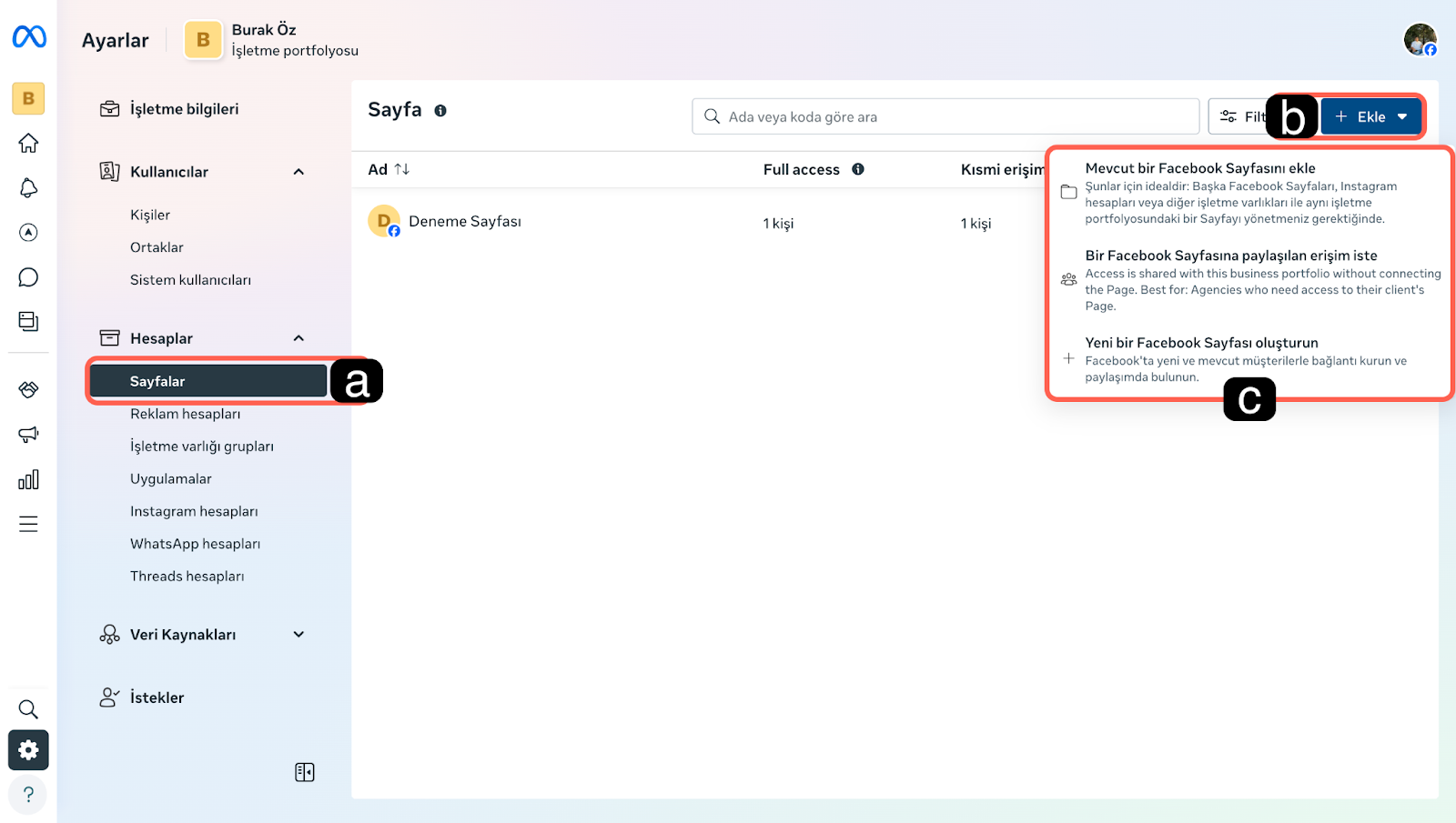 Not: İşlemleri tamamlayabilmek için ilgili Sayfa/Portföy üzerinde yeterli yönetim yetkisine sahip olmanız gerekmektedir. Yetkinin olmadığı durumlarda ekleme veya erişim talebi adımları tamamlanamayabilir.