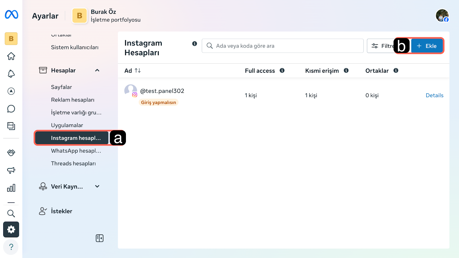 Not: İşletme Portföyünüzde yeterli yönetim yetkisine sahip olmanız ve Instagram hesabınızın giriş bilgilerine erişiminizin olması gerekmektedir.