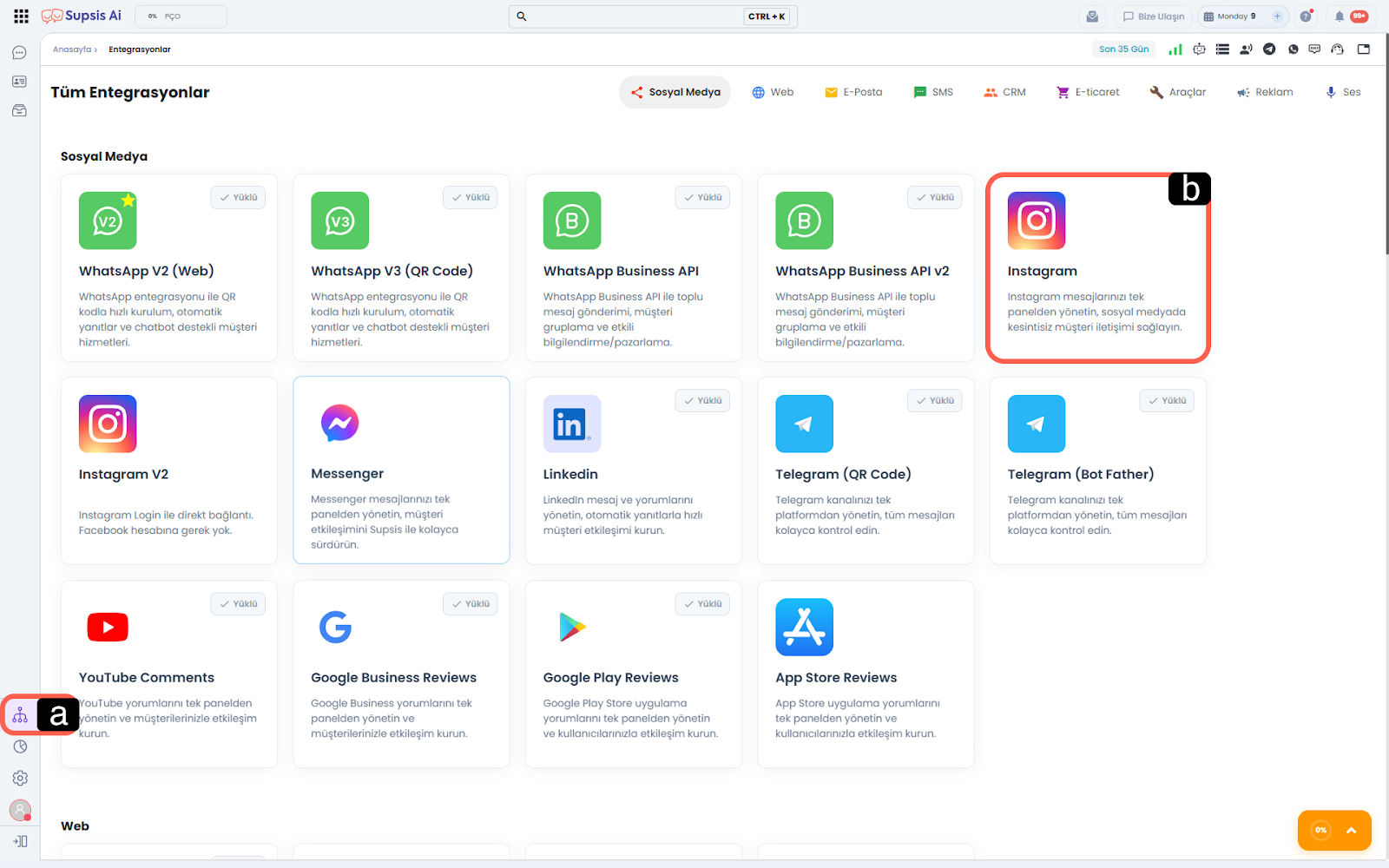 Supsis Ai panelinizin sol menüsünde yer alan Entegrasyonlar simgesine tıklayarak menüye giriş yapınız. - b – Instagram