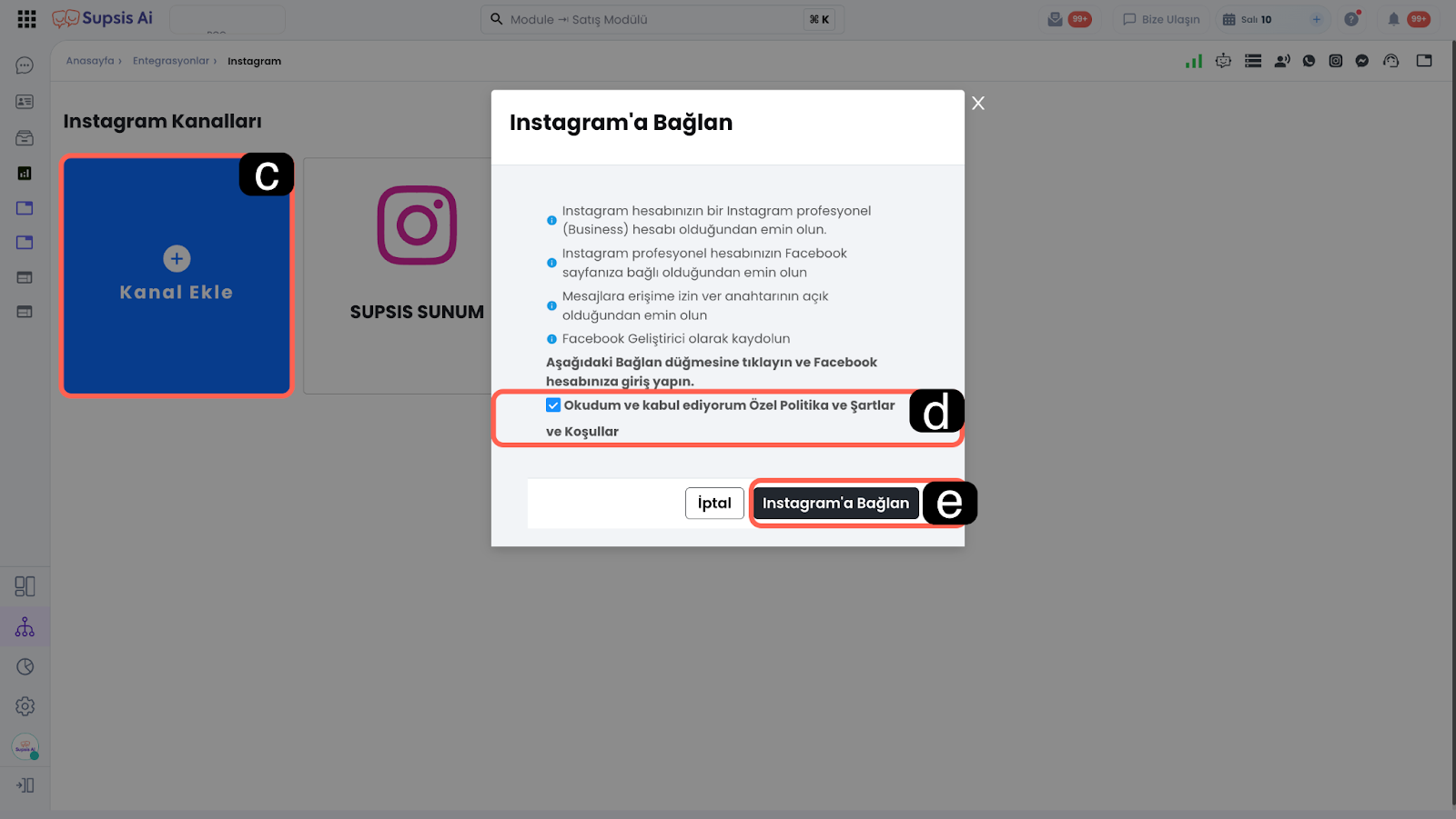 Bu bölüm, Instagram kanalını Supsis Ai paneline ekleme sürecini başlatma ve Meta platformu üzerinden gerekli yetkilendirmeleri tamamlama adımlarını içerir. İşlem sırasında sistem sizi Meta'ya yönlendirecek ve zorunlu izinler onaylanacaktır.