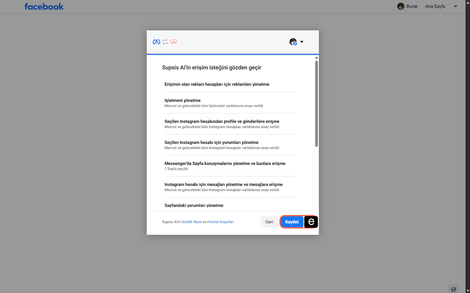 Meta işlem onayının son aşaması için, Supsis Ai'nin talep ettiği tüm izinleri özetleyen bir içerik listesi gösterir. Seçtiğiniz Sayfaları, Hesapları ve verilecek erişim politikalarını kontrol edin.
