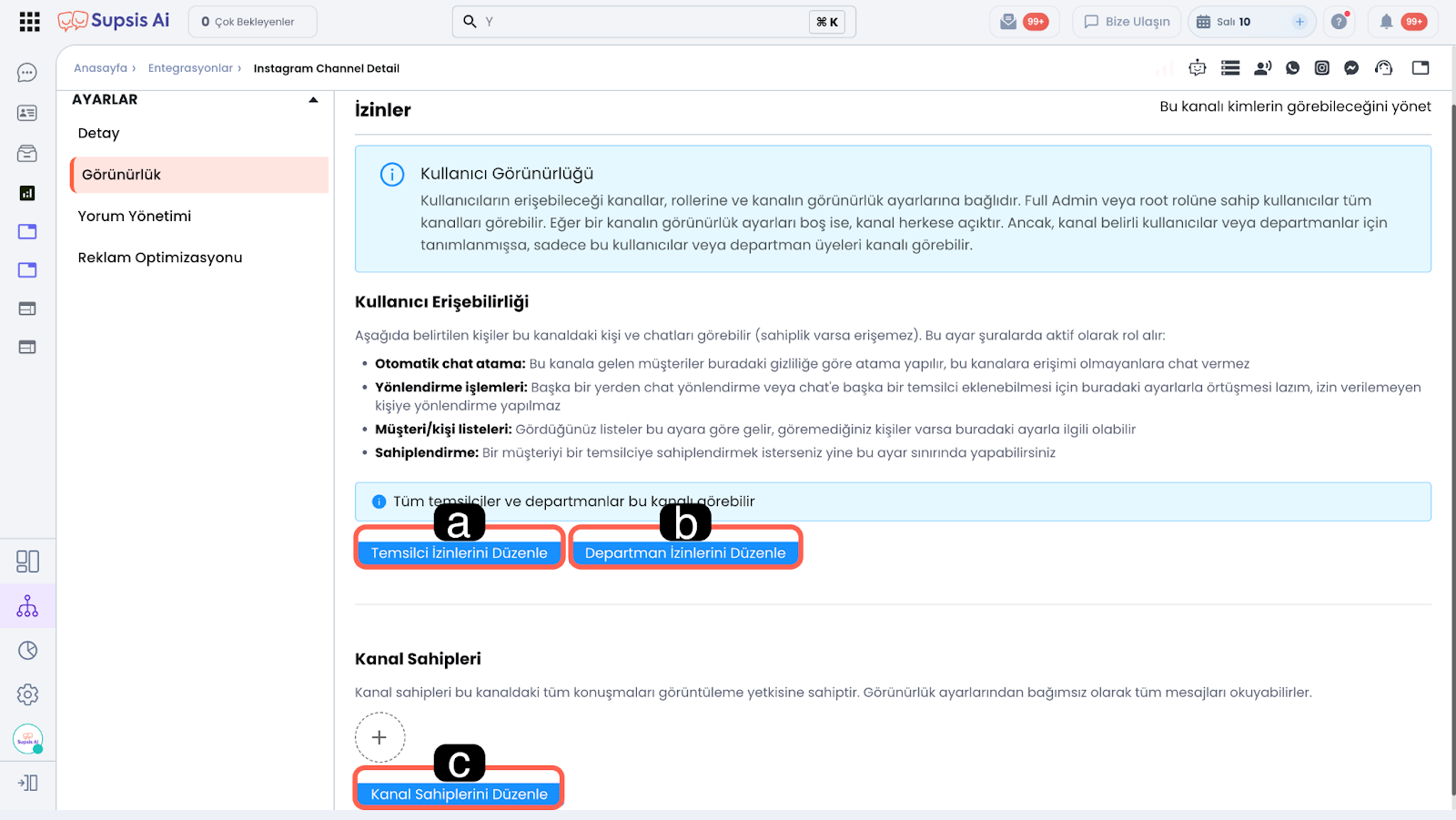 Görünürlük ayarları, entegre edilen Instagram kanalının Supsis Ai platformu içerisinde hangi temsilciler veya departmanlar tarafından görülebileceğini kontrol etmenizi sağlar. Bu yapılandırmanın temel amacı, ekiplerin yalnızca kendi sorumluluk alanlarındaki kanallara erişmesini sağlayarak operasyonel verimliliği ve veri gizliliğini artırmaktır.