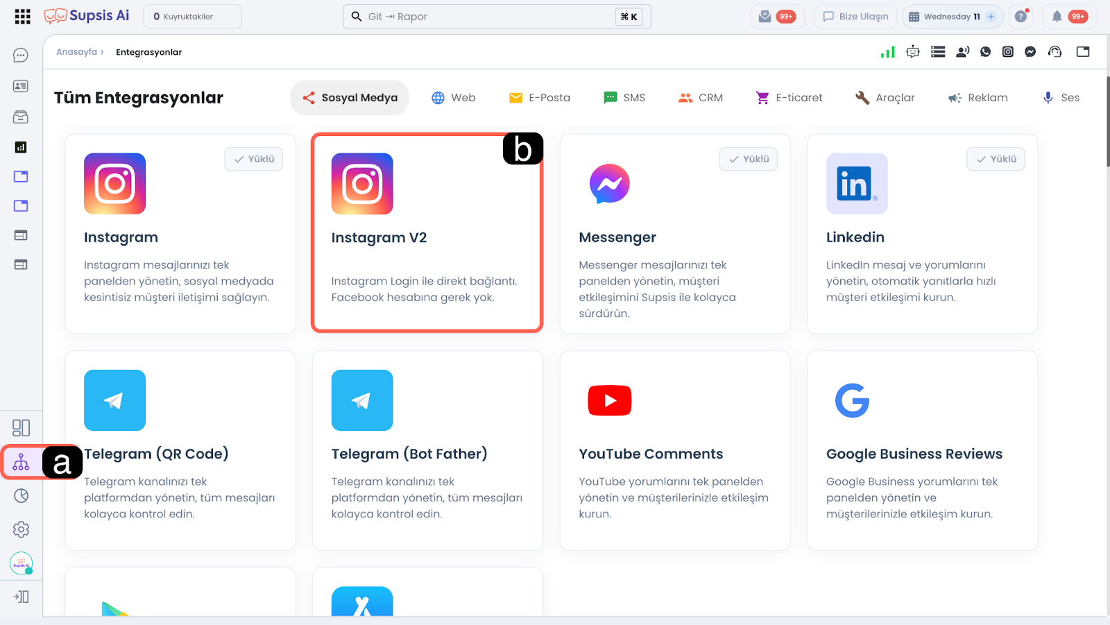 Supsis Ai panelinizin sol menüsünde yer alan Entegrasyonlar simgesine tıklayarak menüye giriş yapınız -