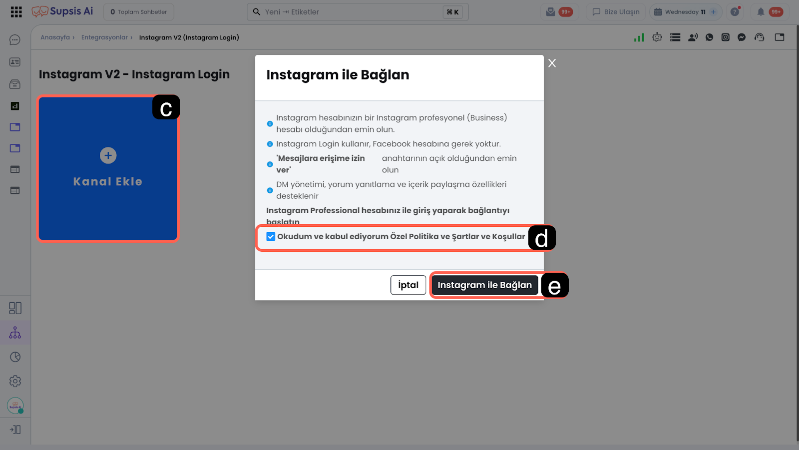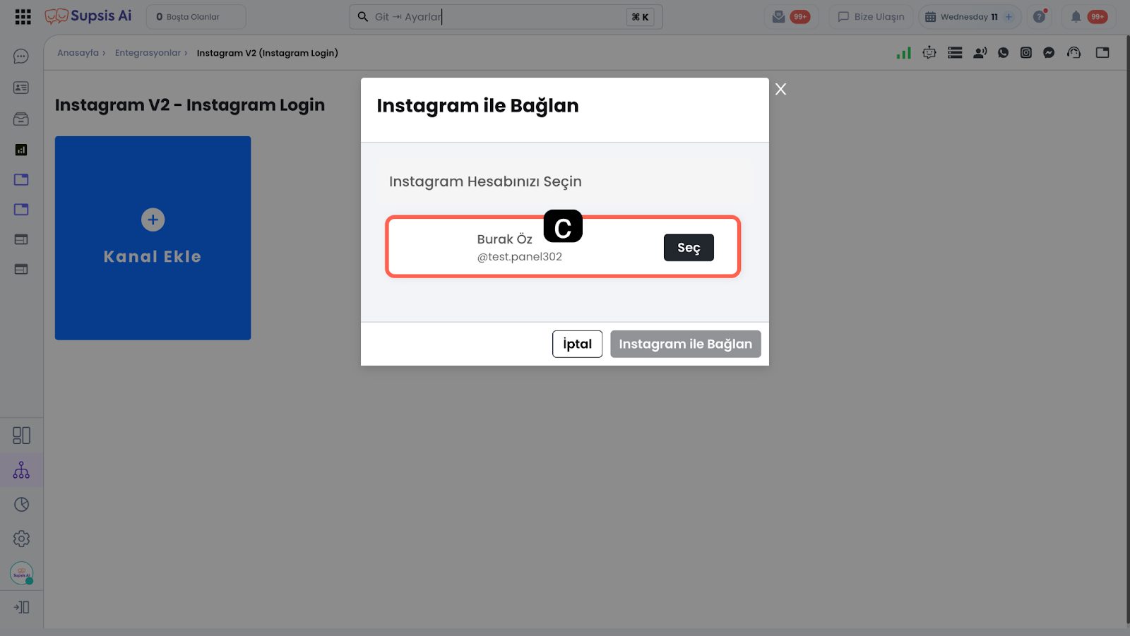 Kanal Adı, Instagram hesabınızın Supsis Ai panelinde görüneceği adı belirlemenizi sağlar. Bu ad Instagram hesabınızın Supsis Ai panelinde görünen adını temsil eder, müşteriler göremez. -