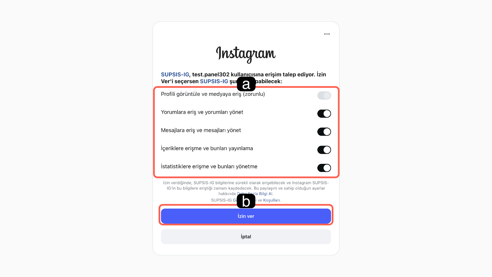 Giriş yaptıktan sonra, Supsis Ai'nin hangi verilere erişebileceğini belirleyen bir izin yönetim menüsü açılır. Bu menüde profil görüntüleme, yorum yönetimi, mesajlara erişim ve istatistiklerin takibi gibi zorunlu yetkiler yer alır. İzinlerin kapsamı, Instagram'ın güncel API politikalarına göre arka planda değişkenlik gösterebilir bu nedenden dolayı entegrasyonun sorunsuz çalışması için Instagram tarafından sunulan tüm seçeneklerin aktif hale getirilmesi gerekmektedir. -