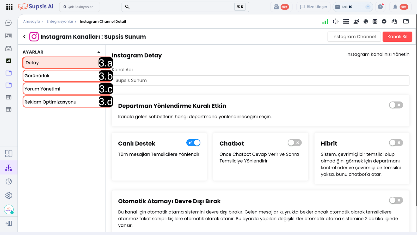 Entegre ettiğiniz Instagram kanalınızın Supsis Ai paneli içindeki çalışma özelliklerini ve ayarlarını bu alandan görüntüleyebilir ve düzenleyebilirsiniz.