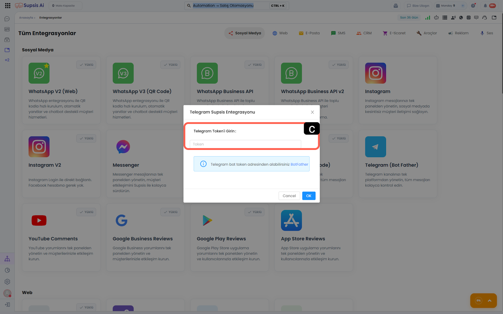 Entegrasyonu sağlamak için Supsis Ai paneli üzerinden aşağıdaki adımları takip edin: