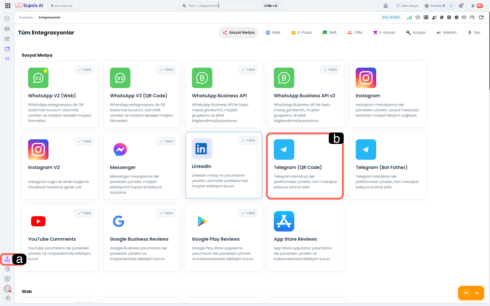 Supsis Ai panelinizin sol menüsünde yer alan Entegrasyonlar simgesine tıklayarak menüye giriş yapınız. -