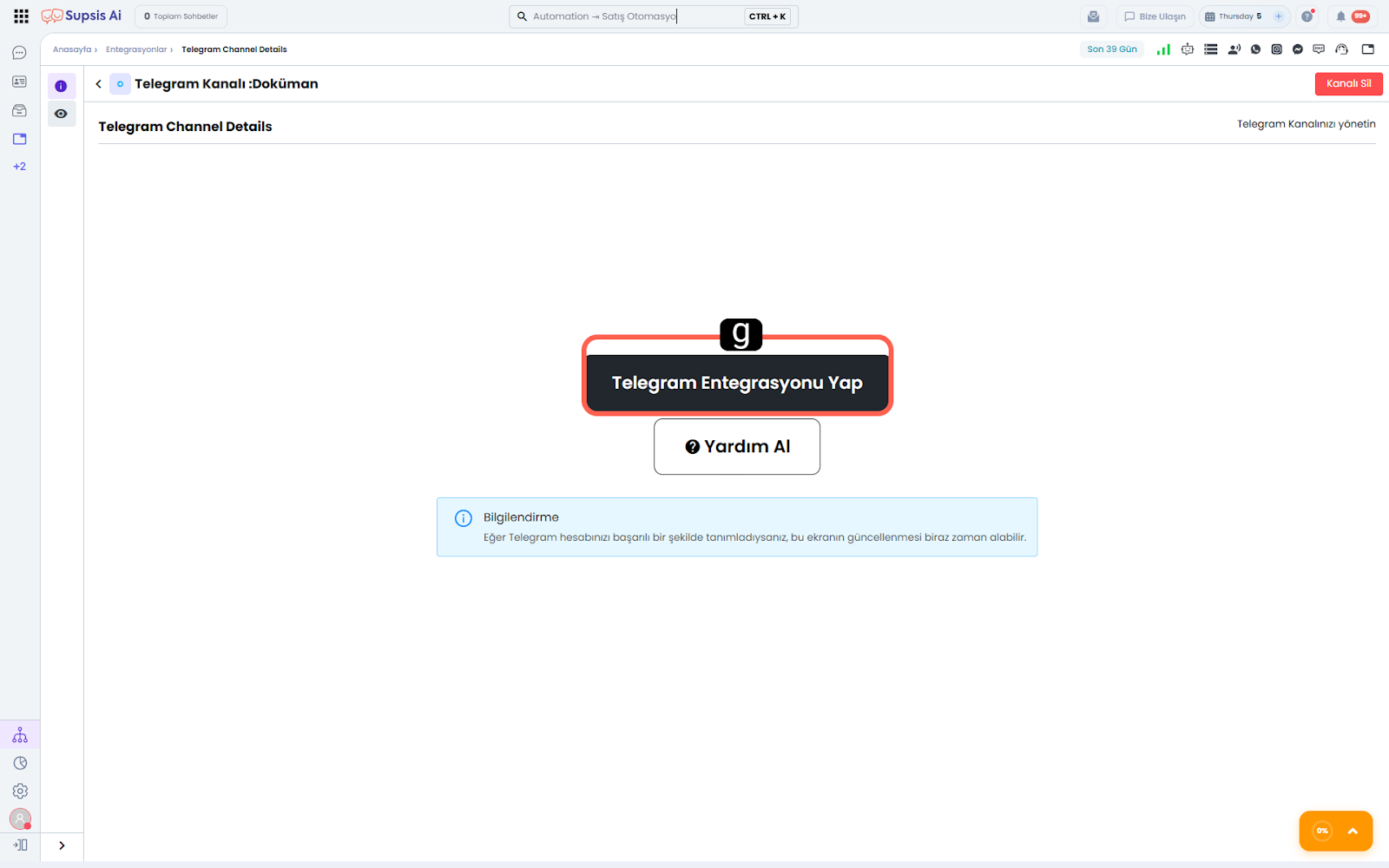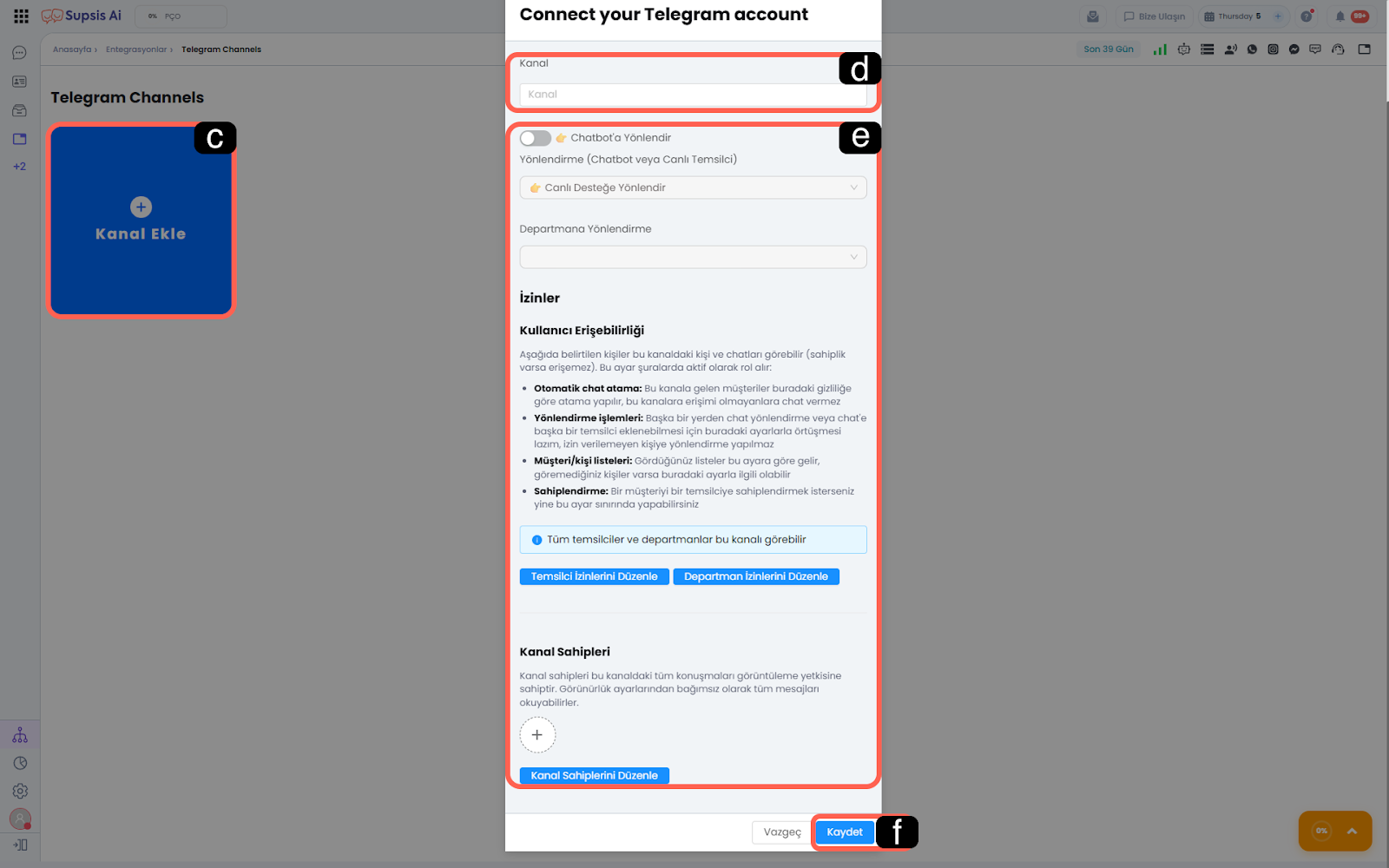 Dokümanın bu bölümü, Telegram kanalınızı Supsis Ai paneline ekleme sürecini başlatma ve platform üzerinden gerekli yetkilendirmeleri tanımlama adımlarını içerir.