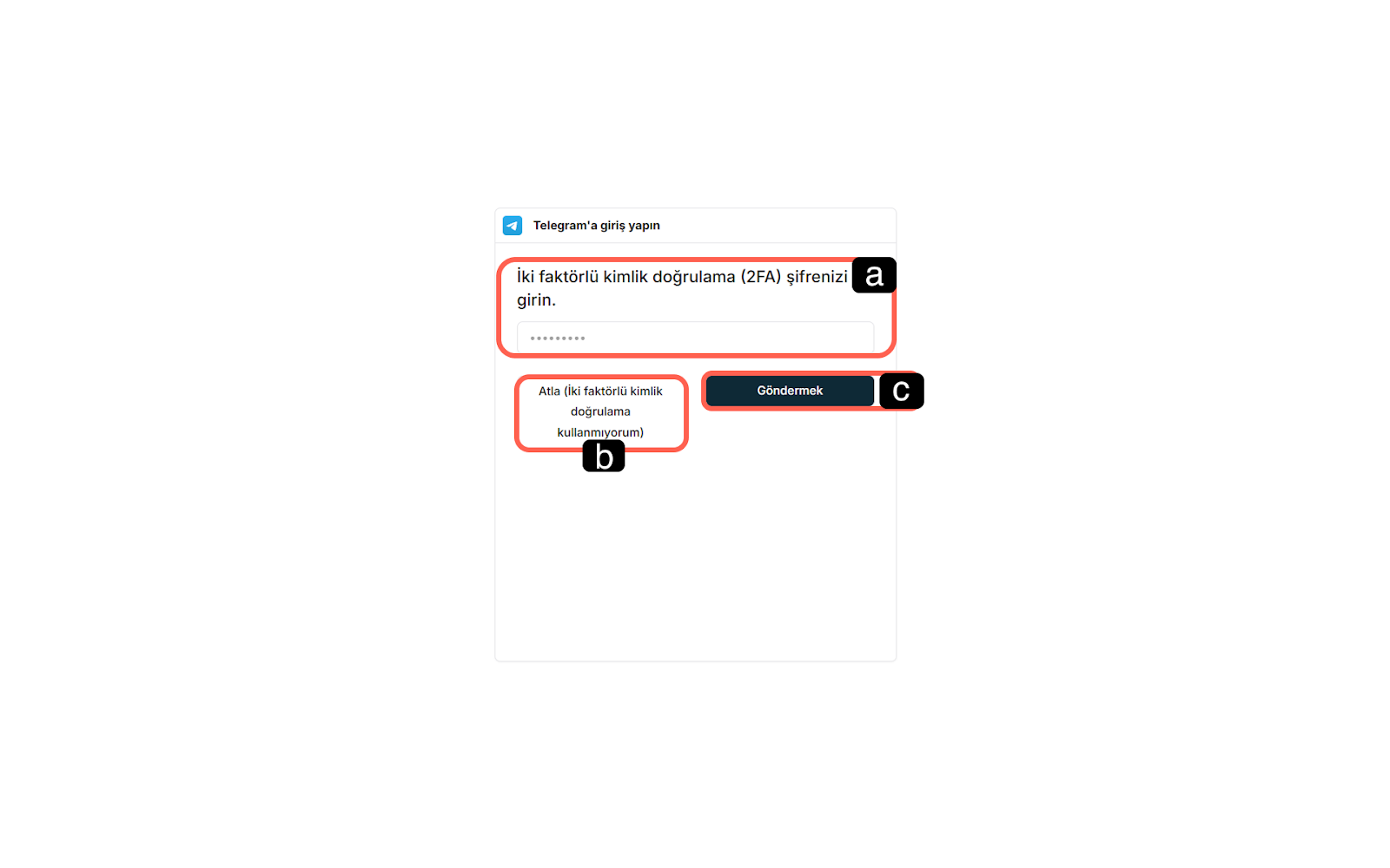 Telegram hesabınızda "İki Adımlı Doğrulama" özelliği aktifse, ekranda görünen alana mevcut 2FA şifrenizi girmeniz zorunludur. -
