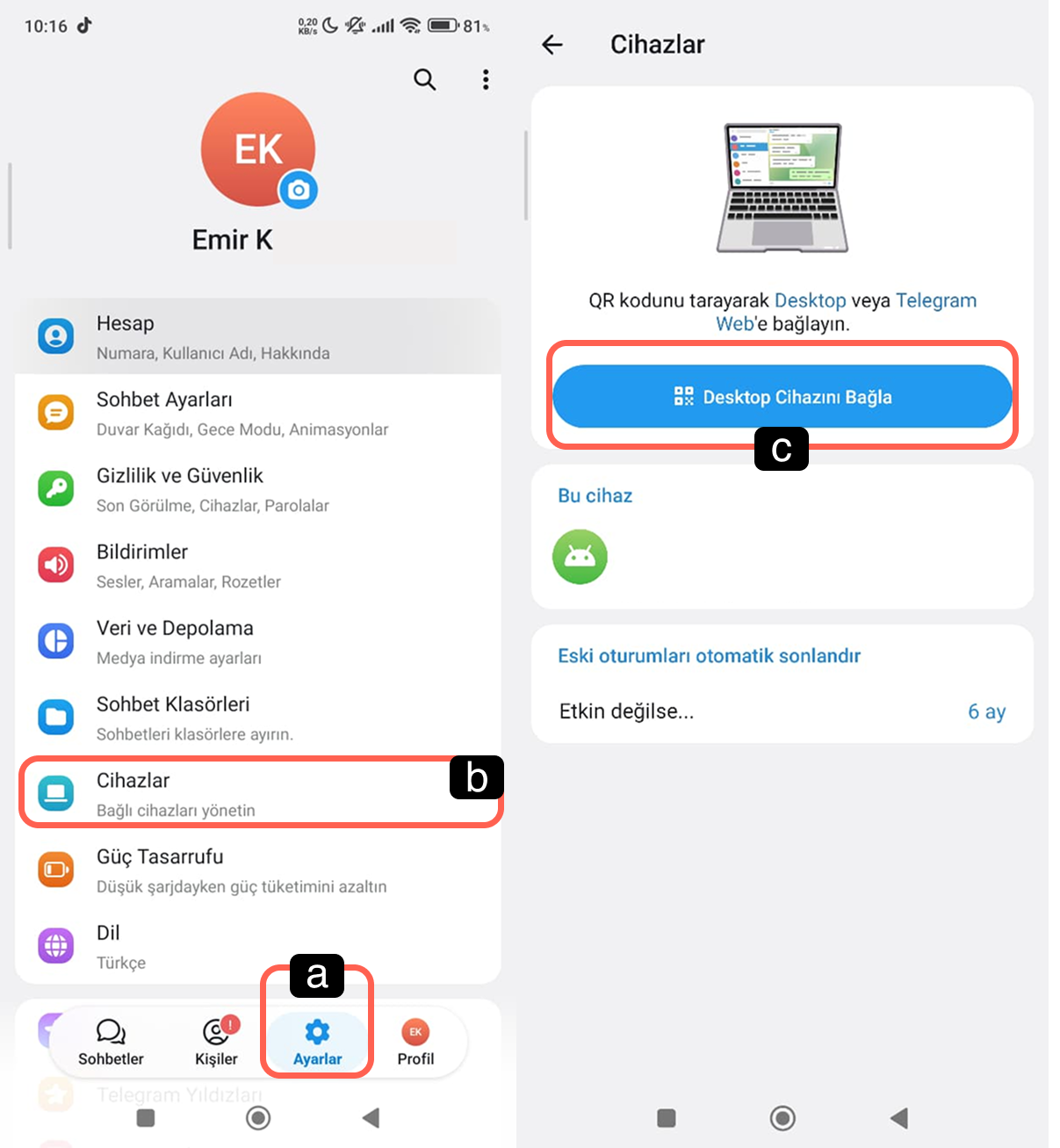 Telegram mobil uygulamasını açın ve alt menüde yer alan Ayarlar sekmesine giriş yapın. -