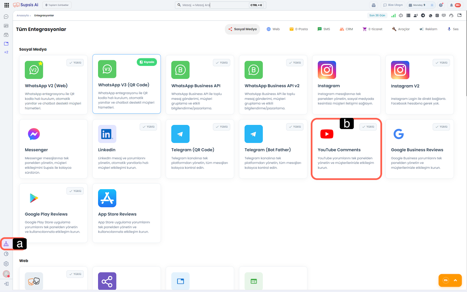 Supsis Ai panelinizin sol menüsünde yer alan Entegrasyonlar simgesine tıklayarak menüye giriş yapınız. -