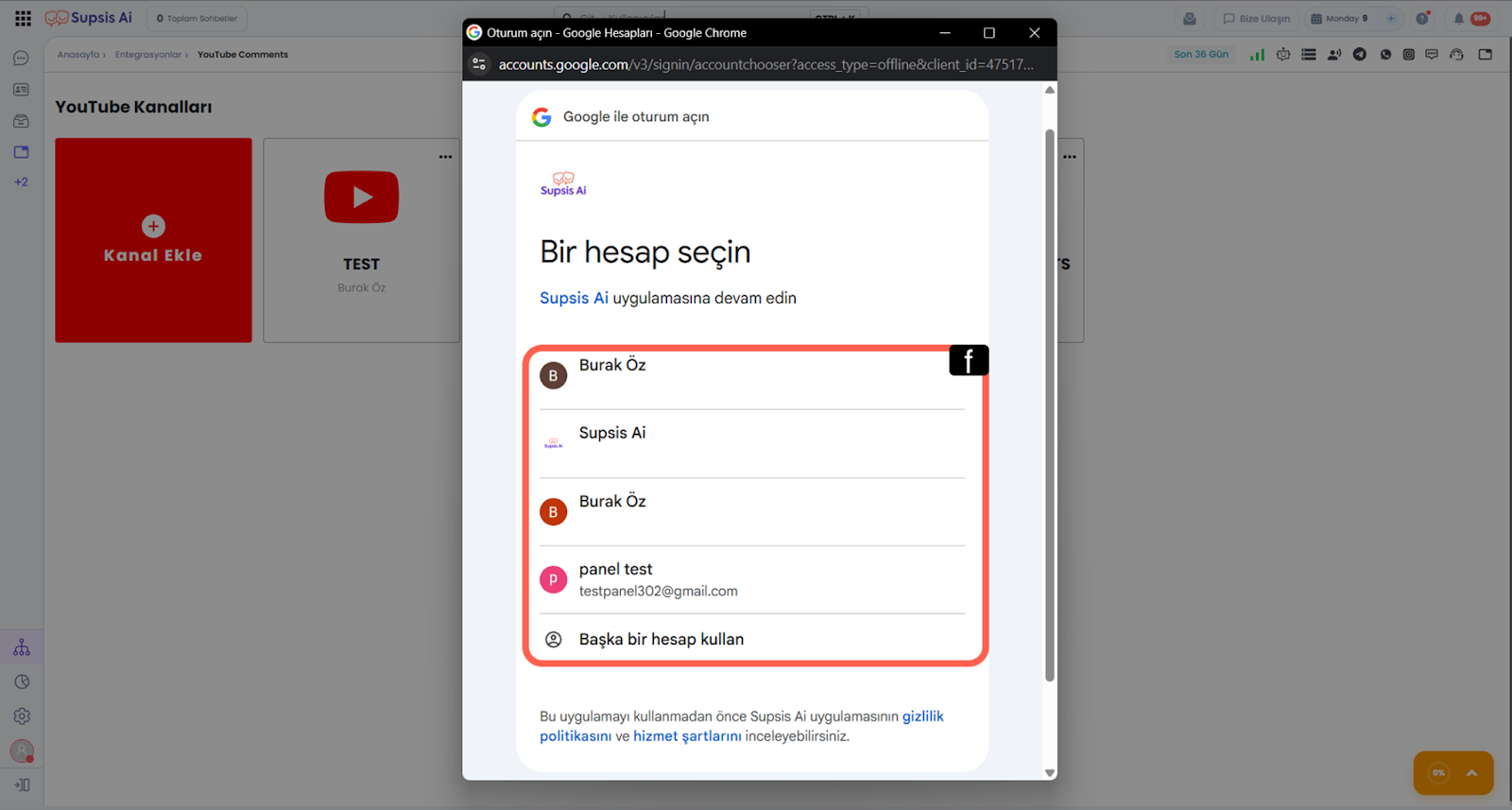 Youtube entegrasyon kanalı içerisindeki Kanal Ekle (artı ikonlu kırmızı alan) butonuna tıklayın. Bu işlem, Youtube hesabınızı Supsis Ai’ye bağlamanız için sizi Google yetkilendirme penceresine yönlendirecektir -