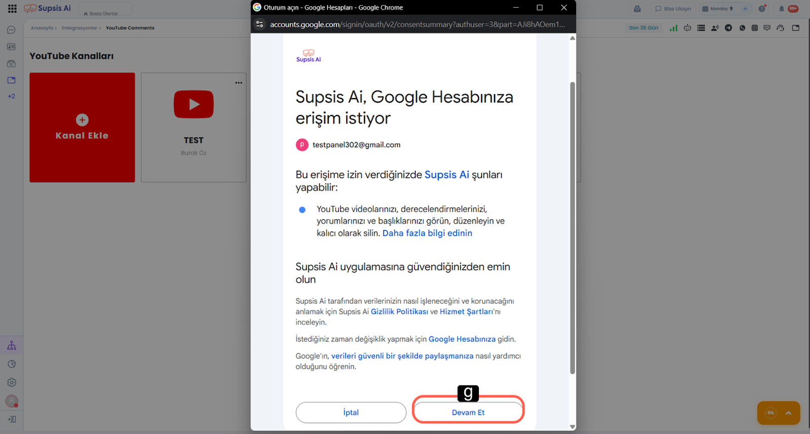 Dokümanın bu bölümü, Supsis Ai'de Youtube yorumlar entegrasyonunu sağlamak için gerekli olan Google üzerinden gerekli yetkilendirmeleri tamamlama adımlarını içerir. İşlem sırasında sistem sizi yetkilendirme işlemleri Google paneline yönlendirecektir.
