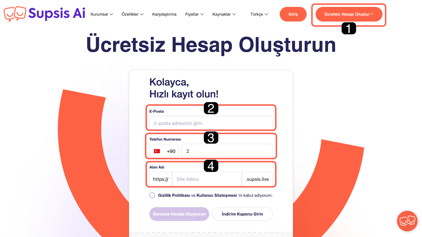 Supsis demo hesabınızı oluşturmak için aşağıdaki adımları sırasıyla takip edebilirsiniz: