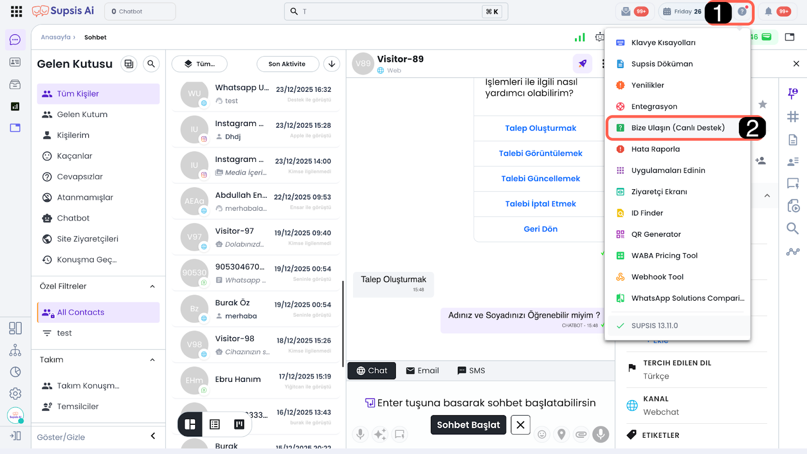 Supsis platformu hakkında detaylı bilgi almak, canlı destekle iletişime geçmek veya teknik ve satış ekiplerimizle görüşme/randevu talep etmek için paneliniz üzerinden aşağıdaki adımları izleyebilirsiniz. Bu adımlar sayesinde destek ekibimize hızlıca ulaşabilir, ihtiyaçlarınıza yönelik bilgi ve yönlendirme alabilirsiniz.